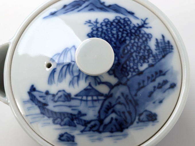 The scenic beauties of Sumi-e ink painting, which are drawn on this Hohin set, showcase a traditional technique used for high class Japanese porcelain. It is requires elevated expertise to express perspective and subtlety only with contrasting density of cobalt blue. On the small surface of each component; mountains, lakes, trees, dwellings, a small Japanese boat, and so on are drawn gracefully.