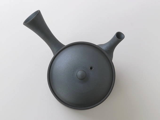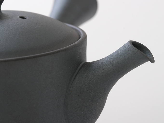 KUROTSUCHI refers to the black color of this teapot. Normally, most teapots are SHUDEI red or brown, but this teapot has a simple matte black color (grayish black). This color is produced by sealing the kiln at high temperatures and incomplete combustion with little oxygen. The carbon generated from the fuel in the kiln is absorbed by the Kyusu, resulting in a black color.