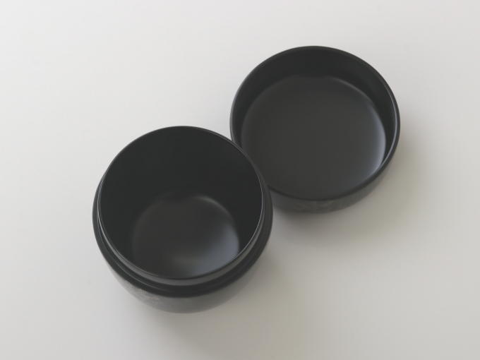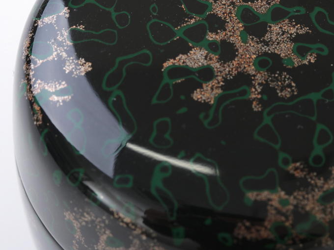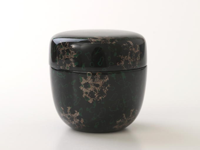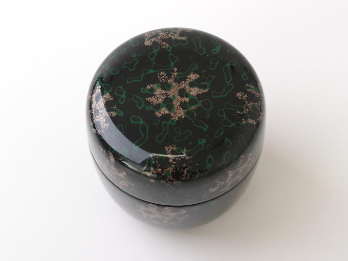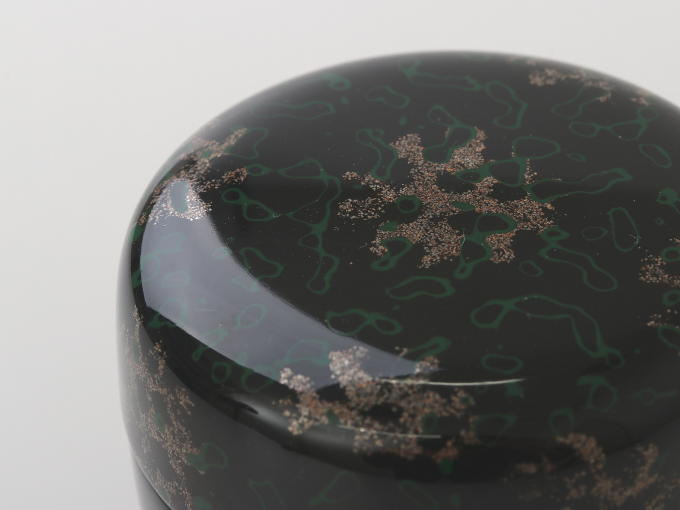 Finished in a timeless black lacquer (Nashi Guro), this Natsume offers a simple yet elegant appearance. Subtle accents of metallic powder add depth and character. After building the speckled texture, green lacquer is applied, followed by metallic detailing, multiple layers of black lacquer, careful polishing, and a refined glossy finish.
