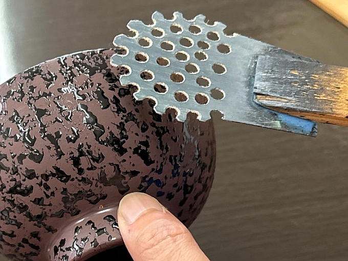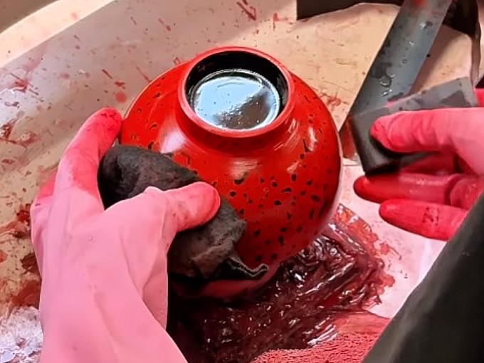 This Natsume is crafted using Kara Nuri, the most representative technique of Tsugaru lacquer craft, in which artisans create distinctive speckled patterns with a perforated spatula, layer colored lacquer, and then polish the surface to reveal vibrant, abstract designs. The word “Kara” signifies excellence, reflecting the superior craftsmanship of this technique.