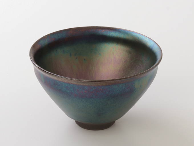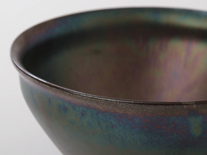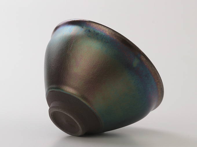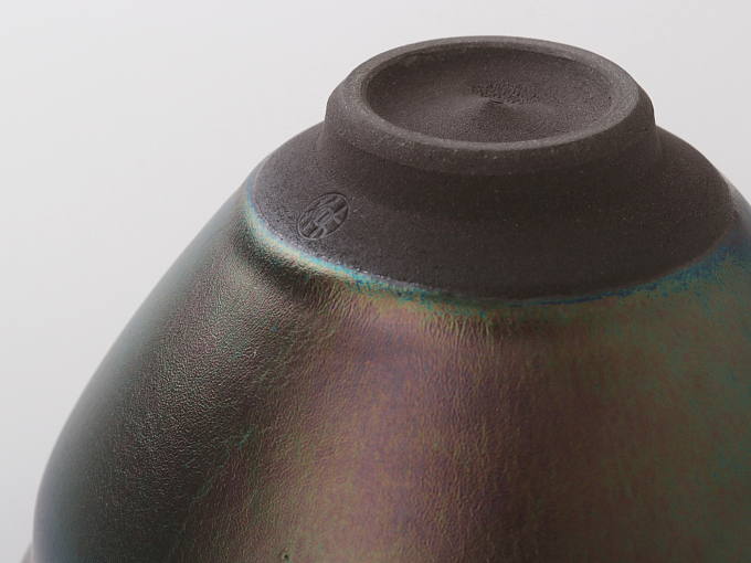 This bowl uses a glaze that forms a thin metallic film on the surface of ceramics, emitting an aurora-like iridescent sheen through light interference. It is a formula exclusively developed by this kiln. It shimmers with a pearlescent glow depending on the angle of light. Achieving this unstable coloration in a consistent and intentional way is extremely difficult, and it is something only this kiln can accomplish.