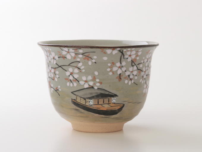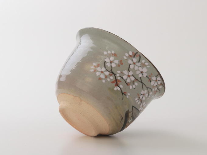 This Matcha bowl is crafted in the Kenzan Cho, featuring a warm red clay body finished with a soft white slip, where elegance and gentle rusticity coexist in perfect harmony. Kenzan Cho refers to the style of pottery associated with Ogata Kenzan, a ceramic artist of the Edo period, as well as the distinctive aesthetic of Kenzan Yaki that he established. Upon this refined surface unfolds a serene scene: graceful weeping cherry blossoms cascading above a tranquil waterway, where a YAKATABUNE, a traditional Japanese boat for enjoying meals and seasonal scenery, glides quietly across the still surface.