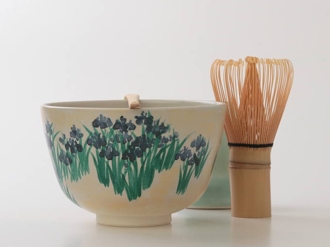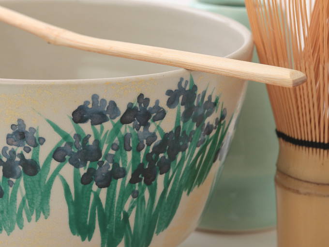This Starter Set includes a Matcha Bowl (Matcha Chawan), Bamboo Whisk (Chasen) with 100 bristles, Whisk Keeper (Kusenaoshi), and Matcha Spoon (Chashaku). We chose KAKITSUBATA ZU handcrafted Matcha Bowl, painted elegantly by typical Kyo Yaki style, for this Starter Set. It is the most standard shape and size, so that it is also perfect for beginners. The Bamboo Whisk has 100 bristles, and therefore can make a very nice lather. Whisk Keeper helps Bamboo Whisk last longer.