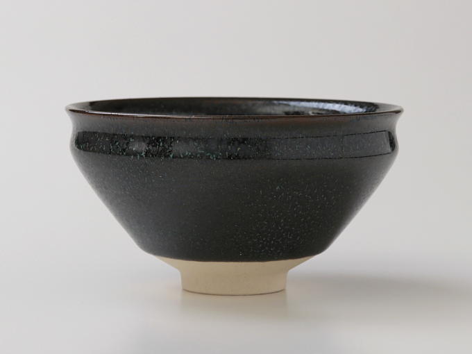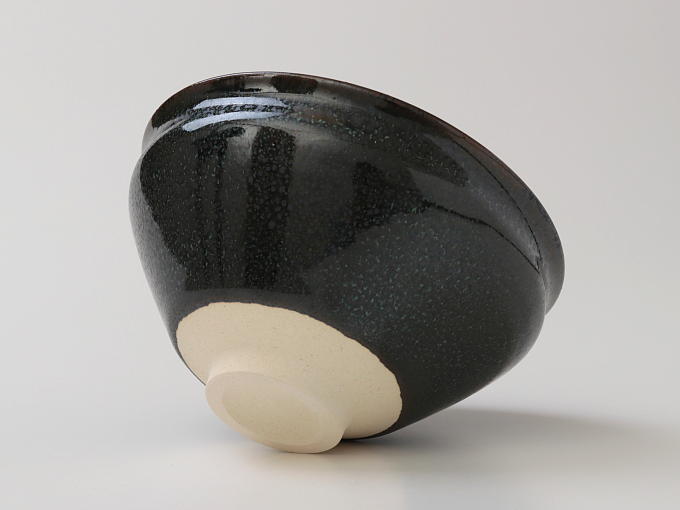 The shape is one of the traditional forms called TENMOKU Chawan. A part of the rim is uniquely hollowed in a horizontal form in the traditional TENMOKU style. The technique called TSUCHIMISE, which means "show clay" in Japanese, is also used for the bottom of TENMOKU style.
