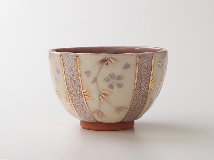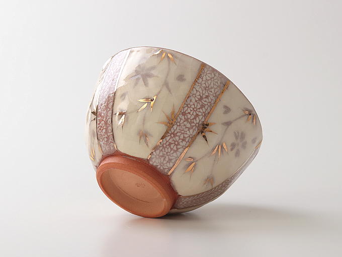 This earthenware Matcha bowl has a graceful aura. The milky white color glaze evokes warmth. SAKURA cherry blossoms and MOMIJI Japanese maple leaves are carved under the milky white glaze and the pattern can be seen through the glaze, which creates the warm, graceful atmosphere. Gold colors are applied over the glaze and also golden narrow lines are vertically painted outside of the bowl, adding to the atmosphere. The light brown and white colors of INKA stamping add a warm accent.