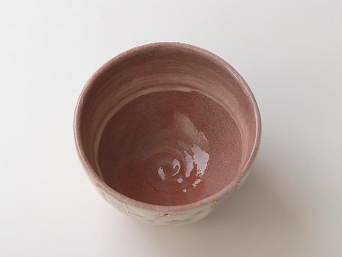 After bisque firing, he wipes liquid white clay over the INKA. White clay remains on the concave part of the INKA and this part looks white. On the other hand, white clay on the surface disappears and we can see the light brown color and INKA patterns emerge. Five different simple yet impressive patterns of INKA are inlayed uniformly around the outside of the Matcha bowl. Three different flowers, whirlpool and herringbone are stamped.