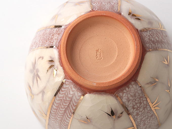 Many complex techniques are used by the artisan to create this bowl. The shape is formed on the potter’s wheel and before it dries, the INKA stamps are placed. Liquid white glaze is applied inside and outside of the bowl. Once it dries, the artisan carefully carves the SAKURA and MOMIJI patterns. The patterns look like paintings, but they are actually carvings. The color of clay shows up and these patterns are light brown.
