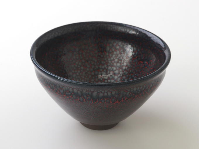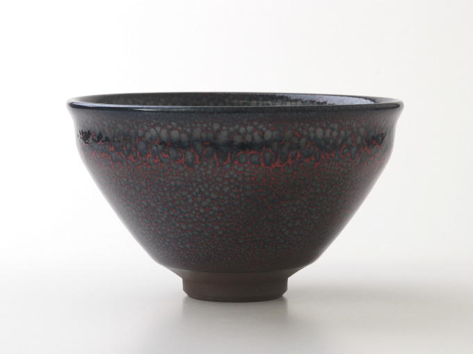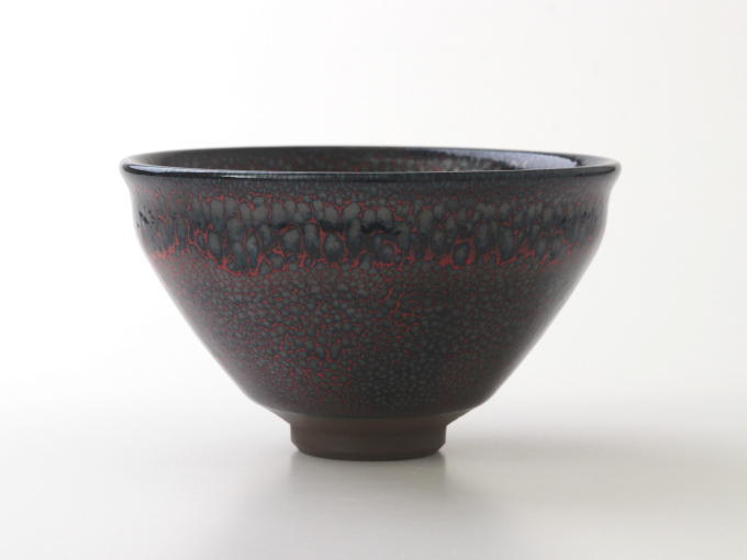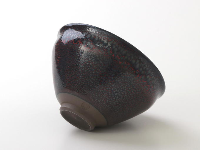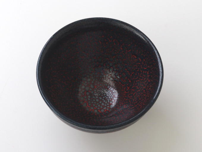SEKI of this name means red, and SAN means hailstone in Japanese. This glaze is one kind of YUTEKI oil droplet glaze. And it is also one kind of TENMOKU glaze. TENMOKU is an iron glaze traditionally known for its impenetrable and elusive nature. In ancient times, it was said that if an artisan tried to pursue YUTEKI glaze or TENMOKU glaze, they would become insolvent. It was developed 800 years ago, and many artisans pursued its technique, but few were successful. Because YUTEKI glaze or TENMOKU glaze was so difficult to create, it was a great honor for tea masters to acquire such precious earthenware at that time.