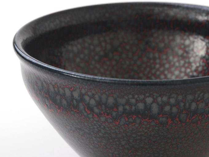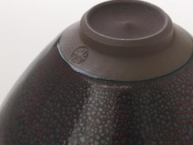 To heat this SEKISAN red oil droplet glaze pottery, extremely delicate and sensitive glaze compounding and temperature management in the kiln are required. In glaze compounding, hundreds of recipes, which just slightly differ, were tried. The process required an extreme amount of time and effort. In the modern earthenware and porcelain industry, temperature management in the kiln is in 10C (18F) increments at best. Even in the same kiln, the temperature differs by location. However, to produce a stable SEKISAN red oil droplet glaze, the temperature in the kiln must be controlled in 1C (1.8F) increments. So, SEKISAN red oil droplet glaze has an extremely low yield ratio and can be quite expensive to create. Tohan Kiln has continuously made efforts to improve or innovate the kiln, glaze, and so on for generations, and the continuous efforts have enabled the production of beautiful SEKISAN red oil droplet glaze at a reasonable price. As a result, this SEKISAN red oil droplet glaze is quite beautiful, elegant and dignified.