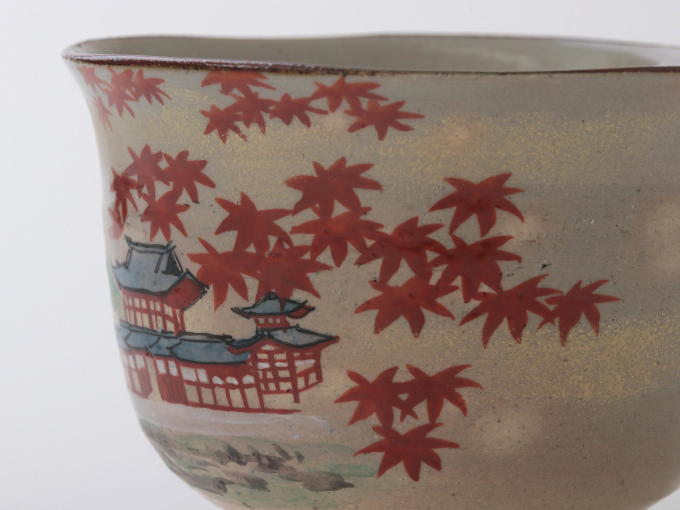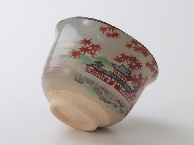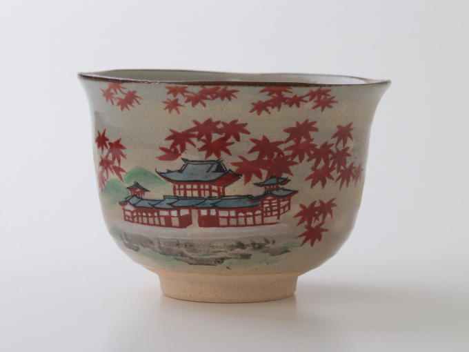 In Kyoto, the season for viewing autumn foliage is surprisingly brief, and there are very few places where one can witness the breathtaking combination of the Phoenix Hall and maple trees as shown on this Matcha bowl. The artisan Zenshoh Yamaoka is able to expertly capture this fleeting yet precious scene.