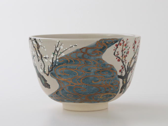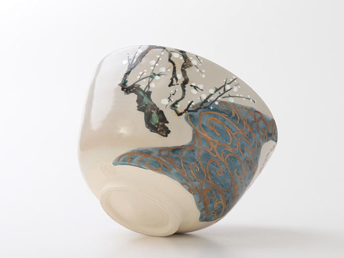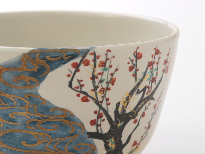 One of the key RINPA techniques, called TARASHIKOMI is used on the trunk and branches. TARASHIKOMI is when colors are dripped into not-fully dried ink. The coincidental effect of the blur makes unique and unforeseeable coloring. Different from folding screen and hanging scroll, it is very difficult to use its technique on a Matcha bowl, but its faithful reproduction of Kohrin’s work expresses realistic image of plum trees. The technically painted trunk and branches with the use of golden color have a texture close to the appearance of the genuine plum trees.
