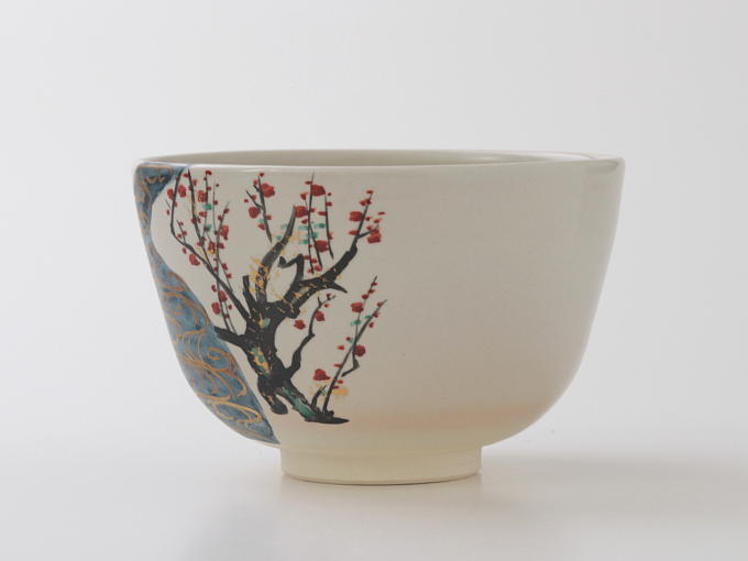 We, Hibiki-an have collaborated with Zenshoh Yamaoka, who is the leading expert of paintings derived from masterpieces in the Middle Ages and acclaimed Kyo Yaki artisan, to release a series of Matcha bowls featuring RINPA paintings. Zenshoh Yamaoka chose KOHAKU BAI ZU. In the real painting, most parts of the plum tree are not shown. However, Zenshoh Yamaoka recreated and completed the painting on this bowl with his imagination.