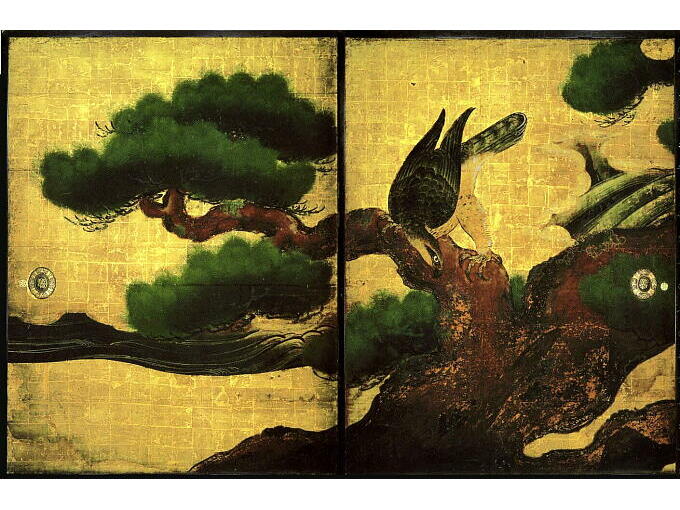 OHIROMA great hall, where the SHOGUN emperor had an audience with the DAIMYO vassal lords, is decorated with paintings that honored the SHOGUN emperor. When the DAIMYO vassal lords looked up to see the SHOGUN emperor, they felt as if the great pine tree arced above the SHOGUN emperor. And the lordly hawk keenly glowered down at the DAIMYO vassal lords. The paintings effectively convey the dignity of the SHOGUN emperor of the past.